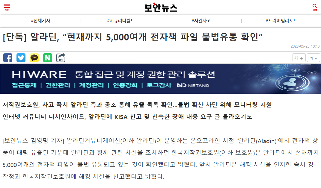 알라딘커뮤네케이션이 운영하는 온오프라인 서점 '알라딘'에서 전자책 상품이 대량 유출된 가운데 알라딘과 함께 관련 사실을 조사하던 한국저작권보호원은 알라딘에서 현재까지 5,000여개의 전차책 파일이 불법 유통되고 있는 것이 확인됐다고 밣겼다. 앞서 알라딘은 해킹 사실을 인지한 즉시 결창청과 한국저작권보호원에 해킹 사실을 신고했다고 밝혔다. 알라딘의 이번 해킹 사실은 이달 16일에 텔레그램 채널 'A.Exploit'에 해커가 관련한 e 북 유출 파일의 샘플이 올라오면서 알려졌다. 보호원은 알라딘이 지난 18일에 보호원의 불법복제물 신고 사이트인 COPY112를 통해 "1천 종의 전자책 무단 배포와 85만여 종의 파일을 추가 배포하겠다는 텔레그램 방을 확인해 알라딘뿐 아니라 출판사, 저자들의 피해가 극심할 것..