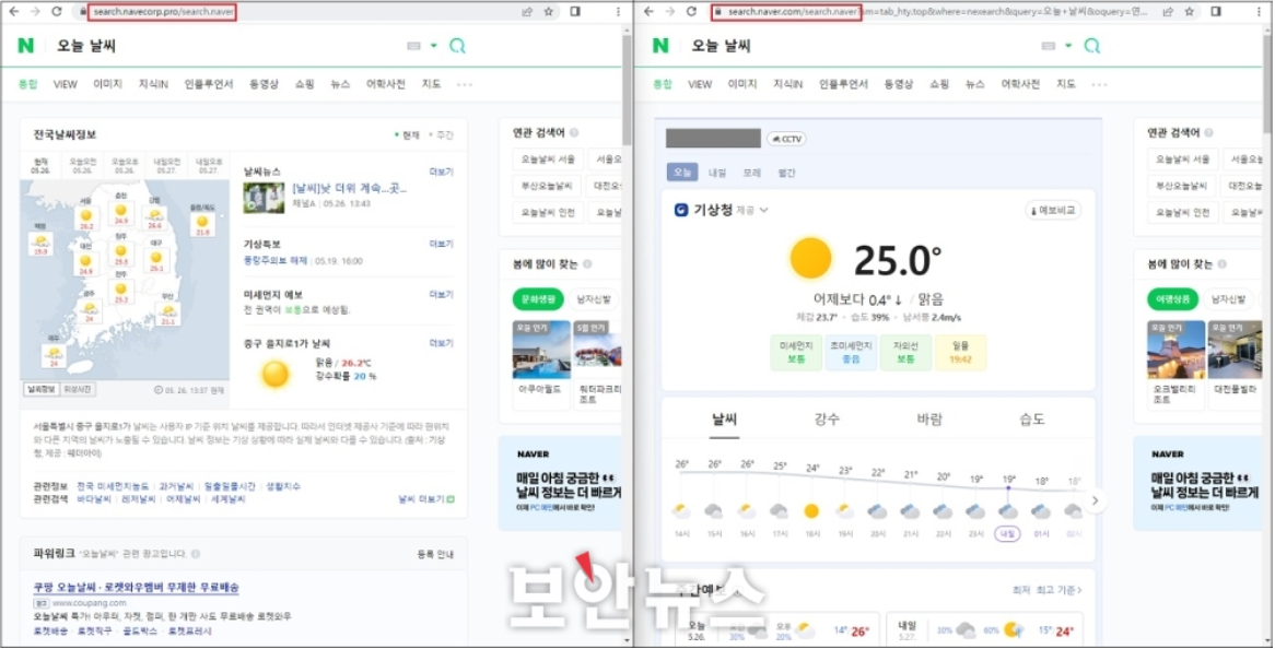왼쪽이 피싱사이트이고 오른쪽이 실제 네이버 사이트이다.