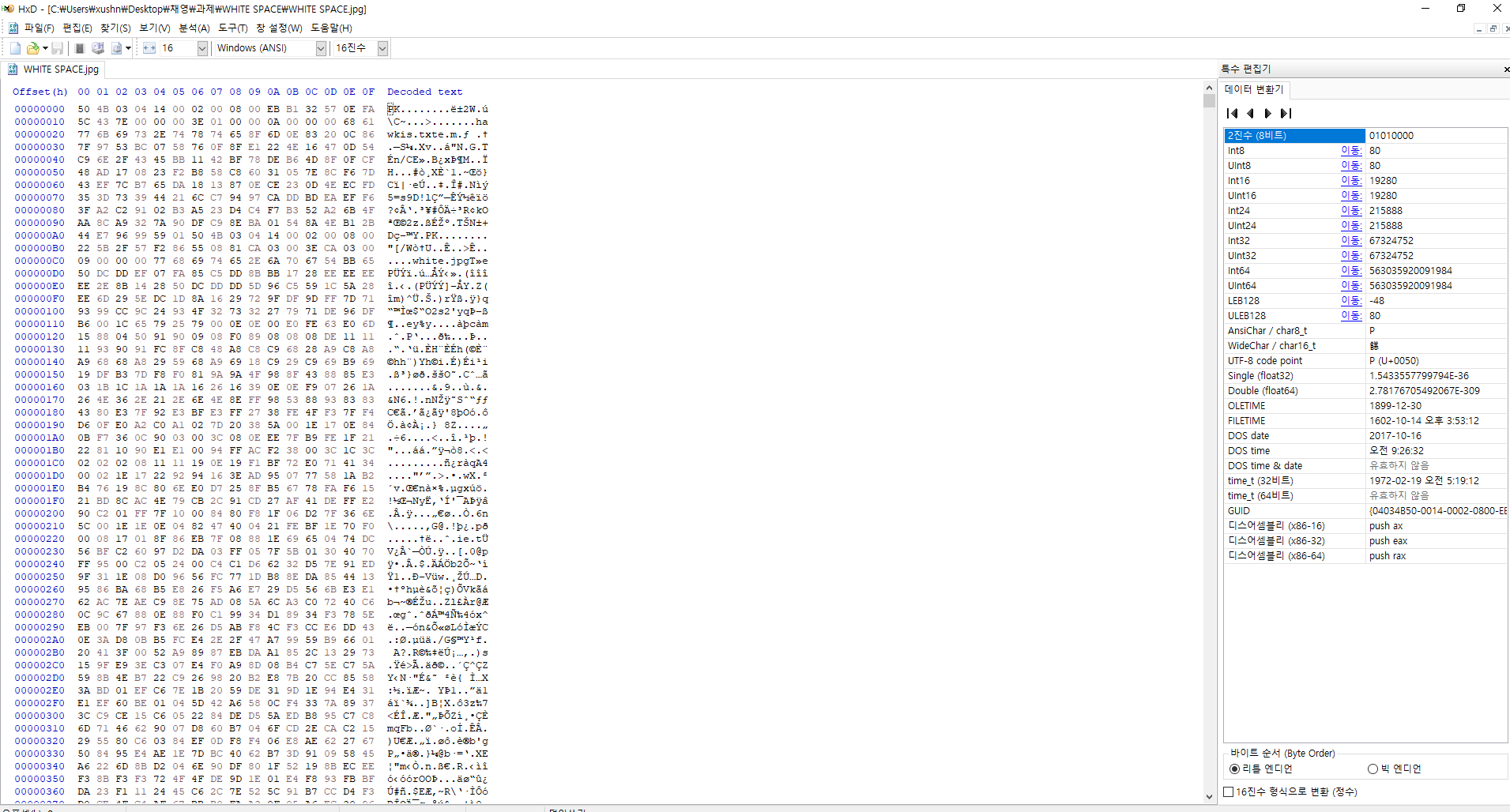 파일 헤더 부분이 50 4B 03 04로 시작하는 것을 확인할 수 있다.